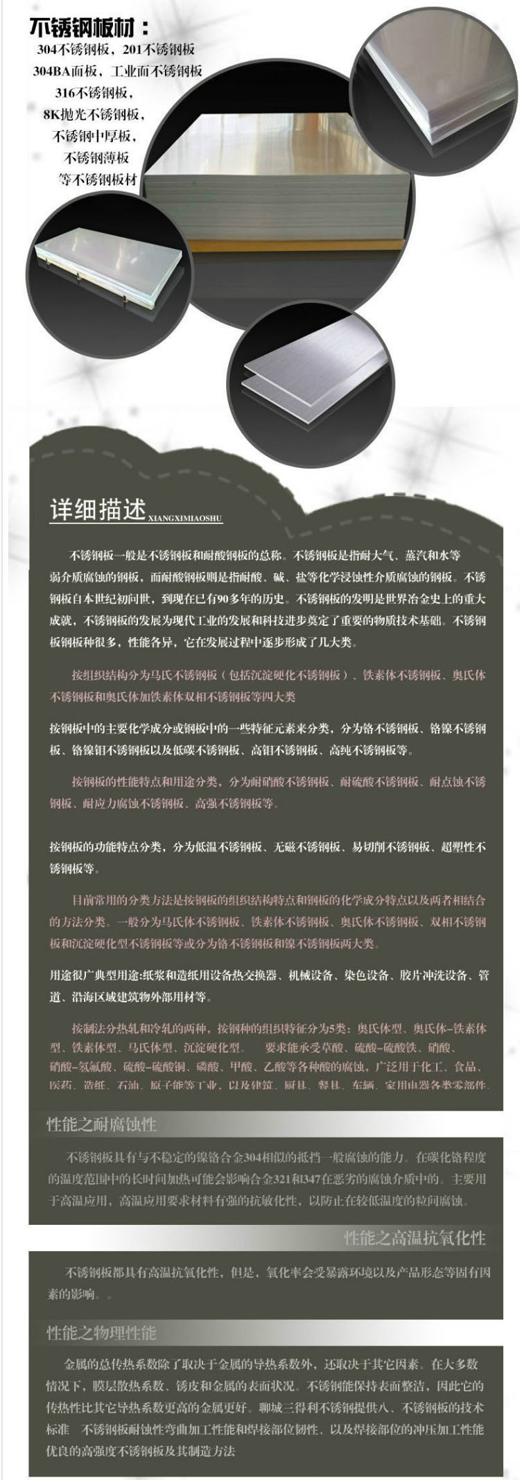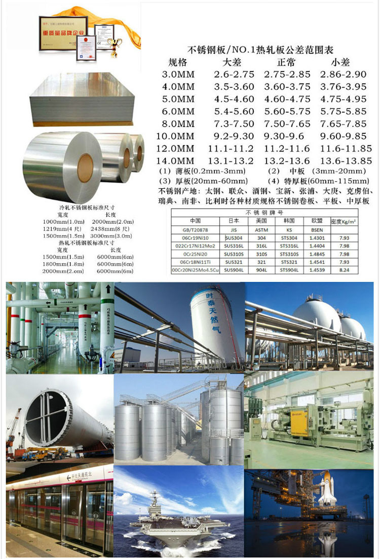 不銹鋼板一般是不銹鋼板和耐酸鋼板的總稱。不銹鋼板是指耐大氣、蒸汽和水等弱介質(zhì)腐蝕的鋼板,而耐酸鋼板則是指耐酸、堿、鹽等化學(xué)浸蝕性介質(zhì)腐蝕的鋼板。不銹鋼板自本世紀(jì)初問(wèn)世,不銹鋼板的發(fā)展為現(xiàn)代工業(yè)的發(fā)展和科技進(jìn)步奠定了重要的物質(zhì)技術(shù)基礎(chǔ)。不銹鋼板鋼板種很多,性能各異,它在發(fā)展過(guò)程中逐步形成了幾大類。按組織結(jié)構(gòu)分為奧氏體不銹鋼板、馬氏不銹鋼板(包括沉淀硬化不銹鋼板)、鐵素體不銹鋼板、和奧氏體加鐵素體雙相不銹鋼板等四大類?按鋼板中的主要化學(xué)成分或鋼板中的一些特征元素來(lái)分類,分為鉻不銹鋼板、鉻鎳不銹鋼板、鉻鎳鉬不銹鋼板以及低碳不銹鋼板、高鉬不銹鋼板、高純不銹鋼板等。按鋼板的性能特點(diǎn)和用途分類,分為耐硝酸不銹鋼板、耐硫酸不銹鋼板、耐點(diǎn)蝕不銹鋼板、耐應(yīng)力腐蝕不銹鋼板、高強(qiáng)不銹鋼板等。按鋼板的功能特點(diǎn)分類,分為低溫不銹鋼板、無(wú)磁不銹鋼板、易切削不銹鋼板、超塑性不銹鋼板等。現(xiàn)常用的分類方法是按鋼板的組織結(jié)構(gòu)特點(diǎn)和鋼板的化學(xué)成分特點(diǎn)以及兩者相結(jié)合的方法分類。一般分為馬氏體不銹鋼板、鐵素體不銹鋼板、奧氏體不銹鋼板、雙相不銹鋼板和沉淀硬化型不銹鋼板等或分為鉻不銹鋼板和鎳不銹鋼板兩大類。用途很廣典型用途:紙漿和造紙用設(shè)備熱交換器、機(jī)械設(shè)備、染色設(shè)備、膠片洗沖設(shè)備、管道、沿海區(qū)域建筑物外部用材等。